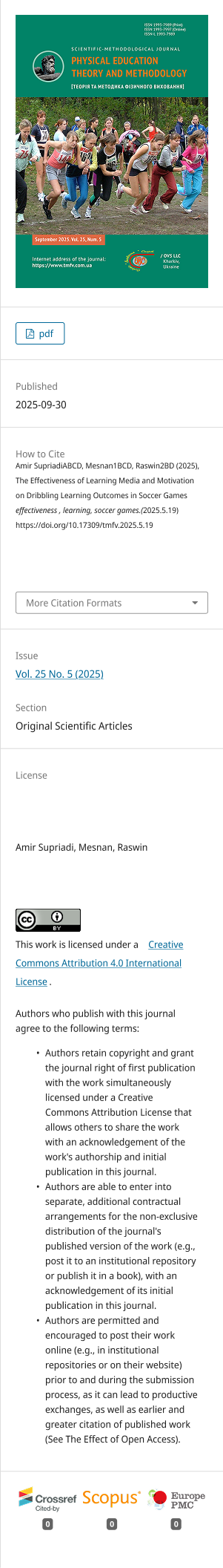 Cite this article as:Supriadi, Amir, Mesnan, Mesnan & Raswin, Raswin. (2025). The Effectiveness of Learning Media and Motivation on Dribbling Learning Outcome in Soccer Games. Physical Education Theory and Methodology, 25(5), 1201-1206. https://doi.org/10.17309/tmfv.2025.5.19